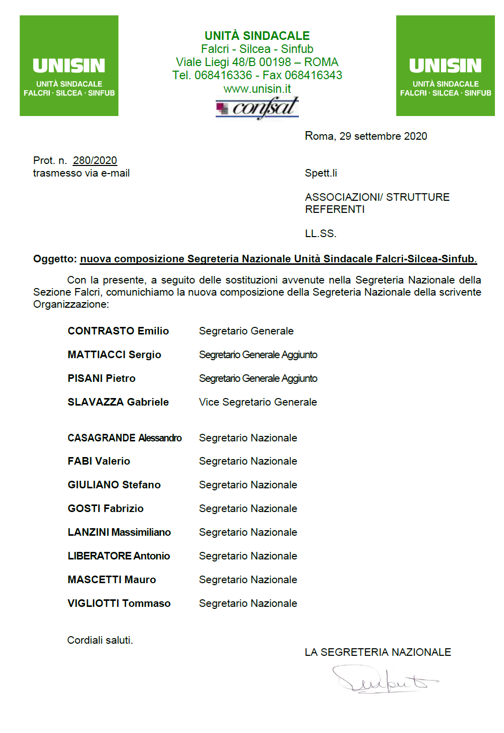 Pertanto la nuova Segreteria Nazionale UNISIN FALCRI risulta così composta: