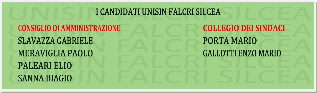 UNISIN FALCRI SILCEA ha predisposto la lista con i propri Candidati nel segno della continuità dei principi ispiratori che hanno caratterizzato nel tempo i nostri “Amministratori”: ESCLUSIVA TUTELA DEGLI INTERESSI DEGLI ISCRITTI AL FONDO.