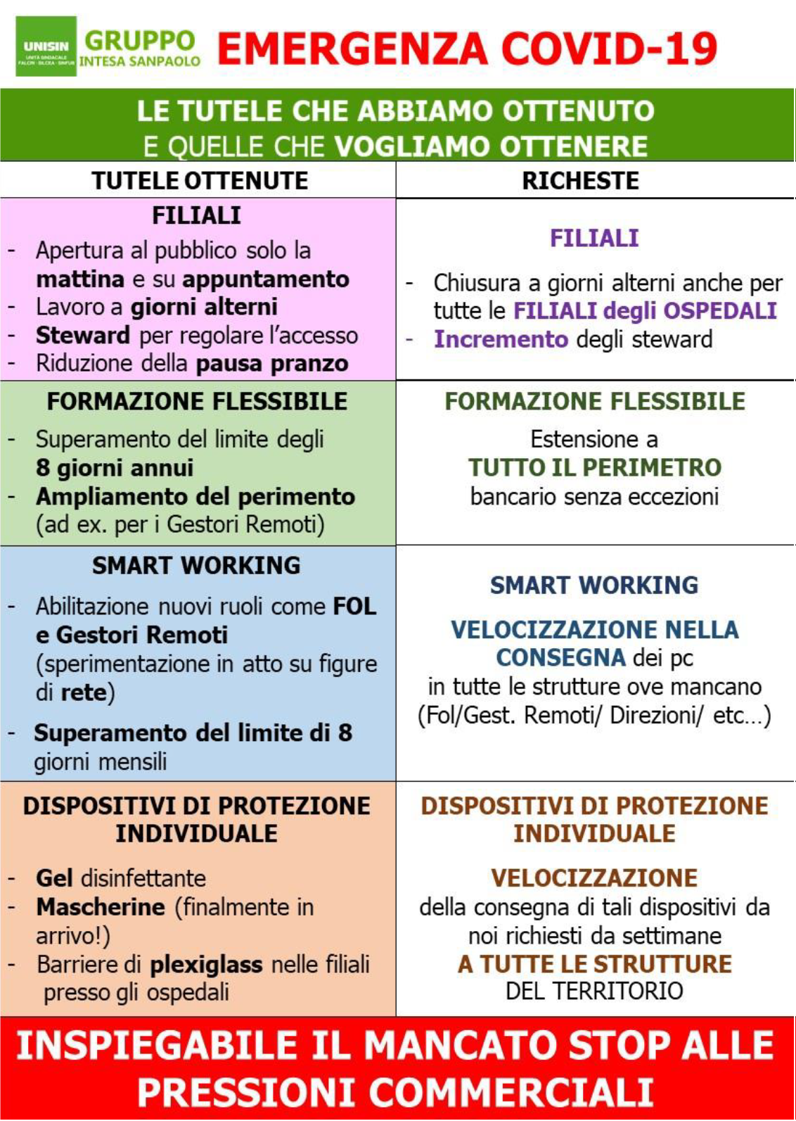 Tenuto conto di ciò e nell’intento di ridurre al minimo i rischi lavorativi, alcune importanti misure organizzative e strutturali, su nostra specifica richiesta, sono state da subito adottate da Intesa Sanpaolo: