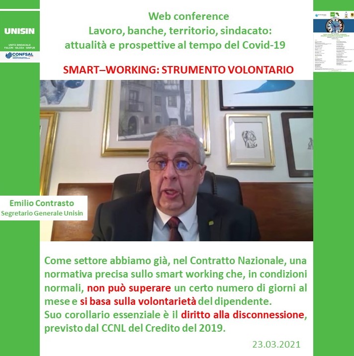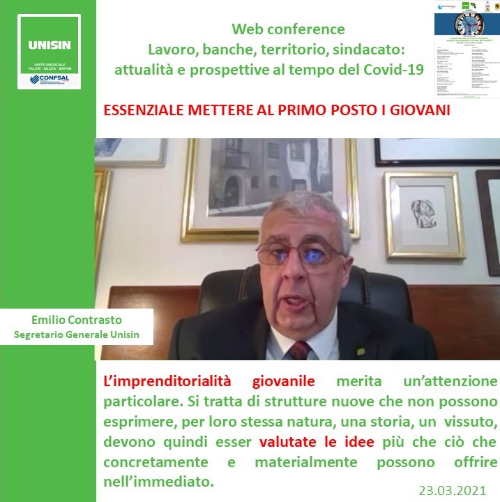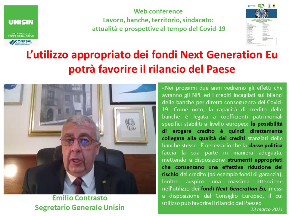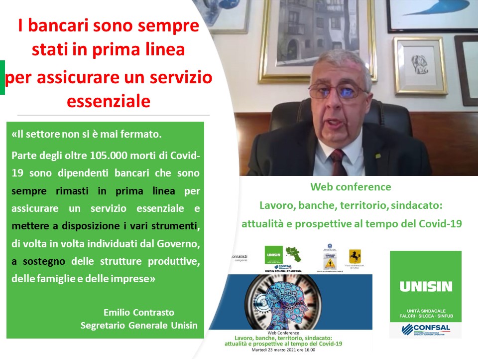 GALLERY – In quattro infografiche, i punti più salienti dell’intervento di Emilio Contrasto (Segr.Generale UNISIN) durante la Web Conference di ieri sul tema “Lavoro,banche, territorio, sindacato: attualità e prospettive al tempo del Covid-19” organizzata da UNISIN Campania.