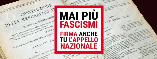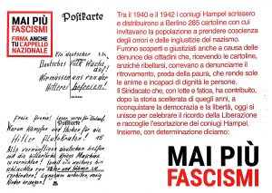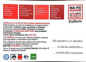 Per questo motivo, in un’epoca in cui crescono le organizzazioni neofasciste e, in Italia, in Europa e nel mondo, tornano parole che contrastano con basilari principi di umanità, in occasione del 25 aprile abbiamo realizzato unitariamente, tutti i settori del credito e delle assicurazioni e delle esattorie, cartoline che raccolgono l’appello nazionale MAI PIU’ FASCISMI e invitano a sottoscrivere l’appello stesso su Change.org.