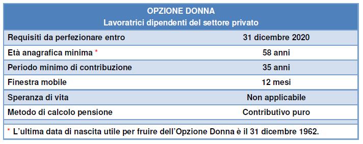 REQUISITI – Per le lavoratrici dipendenti i requisiti necessari per avvalersi di questa forma pensionistica – da perfezionare entro il 31 dicembre 2020 – sono 58 anni di età anagrafica (almeno) e 35 anni di contribuzione (almeno).